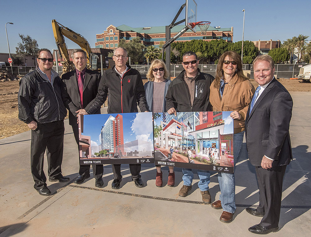 The Westin Tempe has officially broken ground in the heart of Downtown Tempe on Seventh Street between Mill and Myrtle avenues. Developed by Las Vegas-based CAI Investments, the 18-story Westin Tempe will be a full-service business hotel. Participants in the ceremony included CAI Founder Christopher Beavor, Tempe Mayor Mark Mitchell, Darin Sender of Sender Associates, and Vice President of Lodging Development for Marriott International, Inc., Tiffany Cooper.